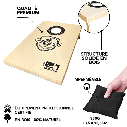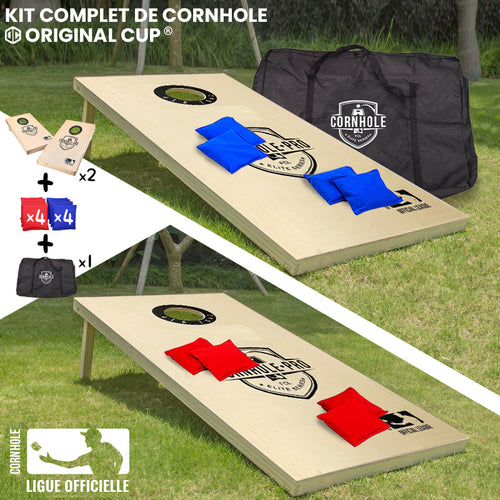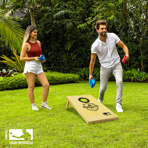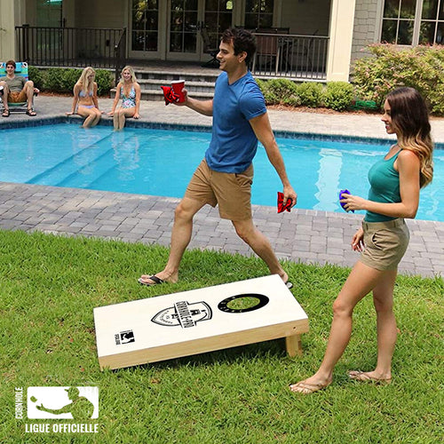 KIT COMPLET : Ce Kit officiel Cornhole comprend 2 planches en bois avec pieds pliables et 8 Sacs en tissu rouges et bleus. Léger et facile à transporter grâce à sa housse de protection. Jeu d'extérieur idéal pour jouer entre amis et l'emmener partout lors de weekends ou vacances.