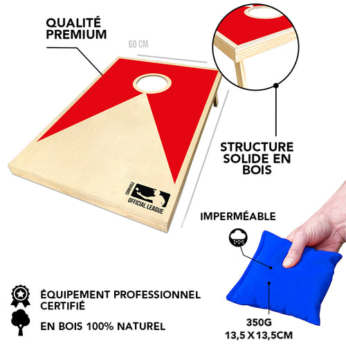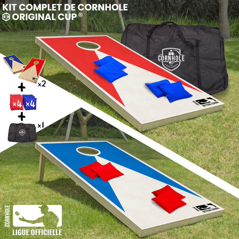 - KIT COMPLET : Ce Kit officiel Cornhole comprend 2 planches en bois avec pieds pliables et 8 Sacs en tissu rouges et bleus. Léger et facile à transporter grâce à sa housse de protection. Jeu d'extérieur idéal pour jouer entre amis et l'emmener partout lors de weekends ou vacances.