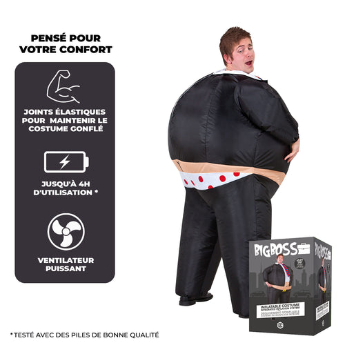 Déguisement gonflable insolite de Big Boss. Facile à gonfler grâce à ses 2 ventilateurs intégrés fonctionnant avec piles (type AA non fournies).