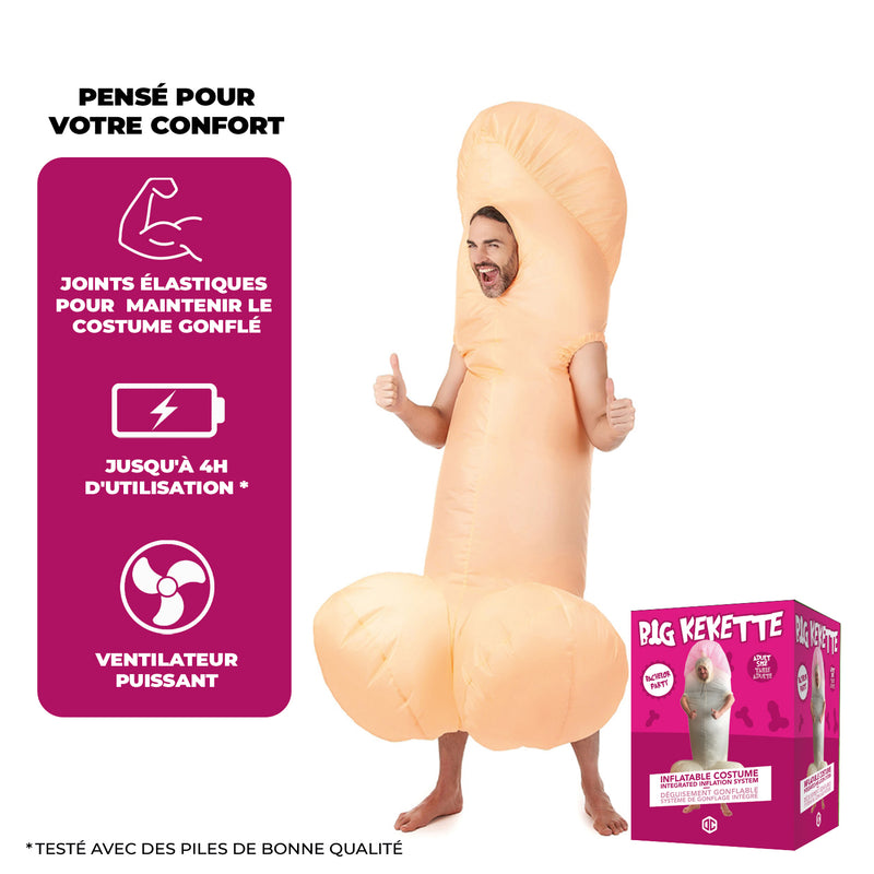 Déguisement gonflable insolite. Facile à gonfler grâce à ses 2 ventilateurs intégrés fonctionnant avec piles (type AA non fournies).