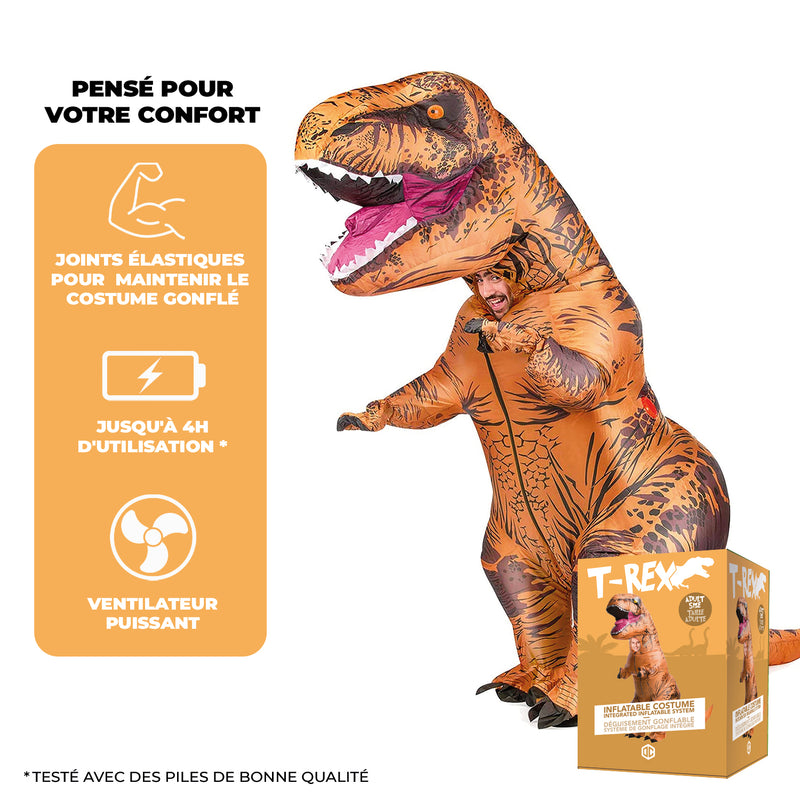 Déguisement gonflable insolite de T-Rex. Facile à gonfler grâce à ses 2 ventilateurs intégrés fonctionnant avec piles (type AA non fournies).