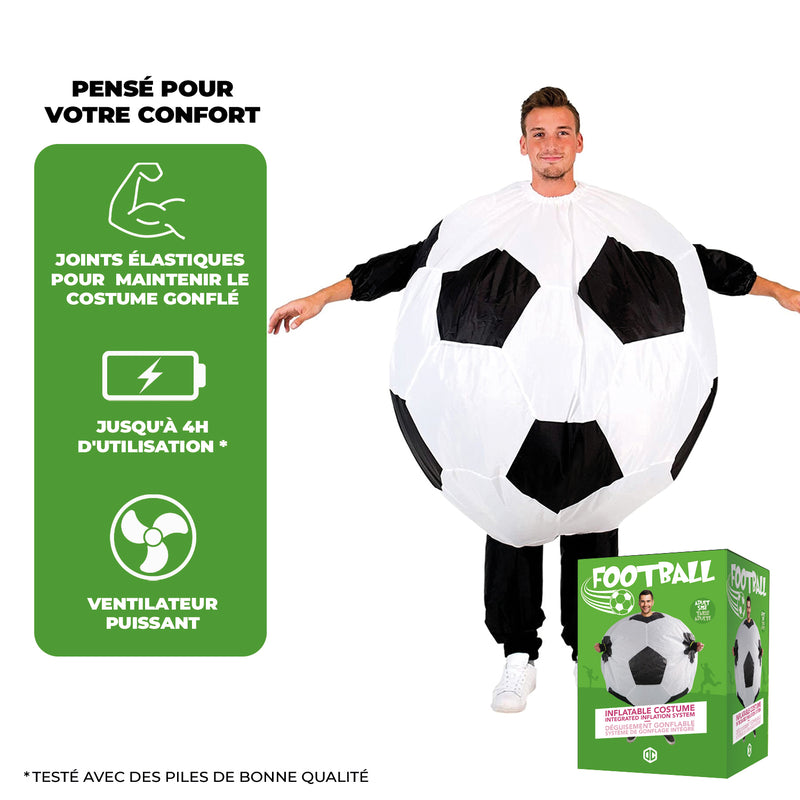 Déguisement gonflable insolite en forme de Ballon de Football. Facile à gonfler grâce à ses 2 ventilateurs intégrés fonctionnant avec piles (type AA non fournies).