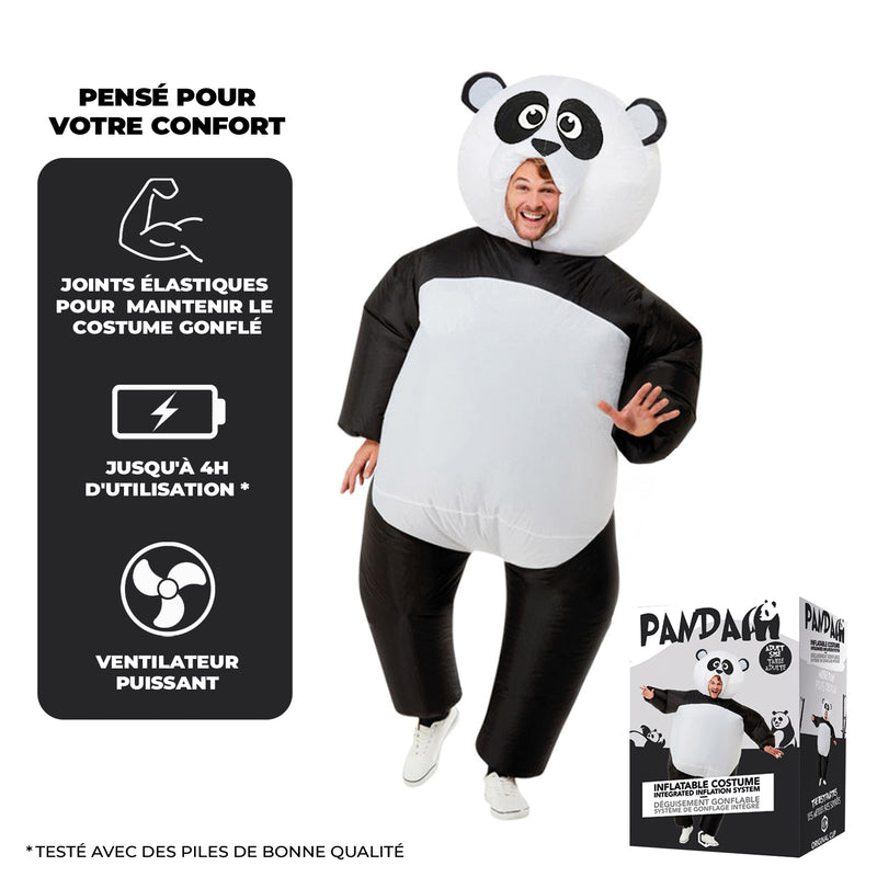 Déguisement gonflable insolite de Panda. Facile à gonfler grâce à ses 2 ventilateurs intégrés fonctionnant avec piles (type AA non fournies).