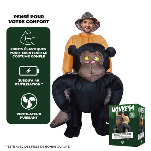 Déguisement gonflable insolite de Singe. Facile à gonfler grâce à ses 2 ventilateurs intégrés fonctionnant avec piles (type AA non fournies).
