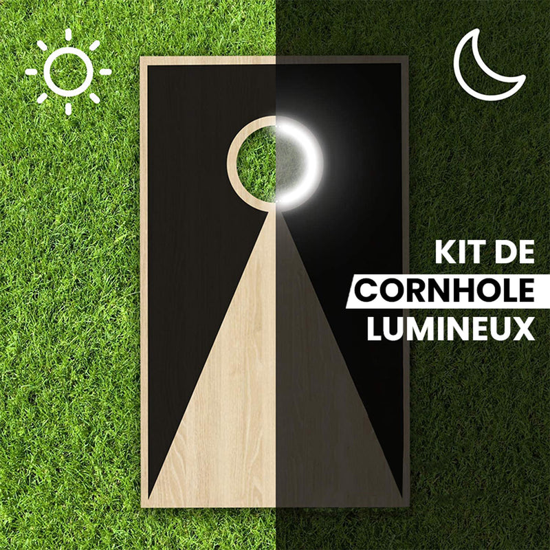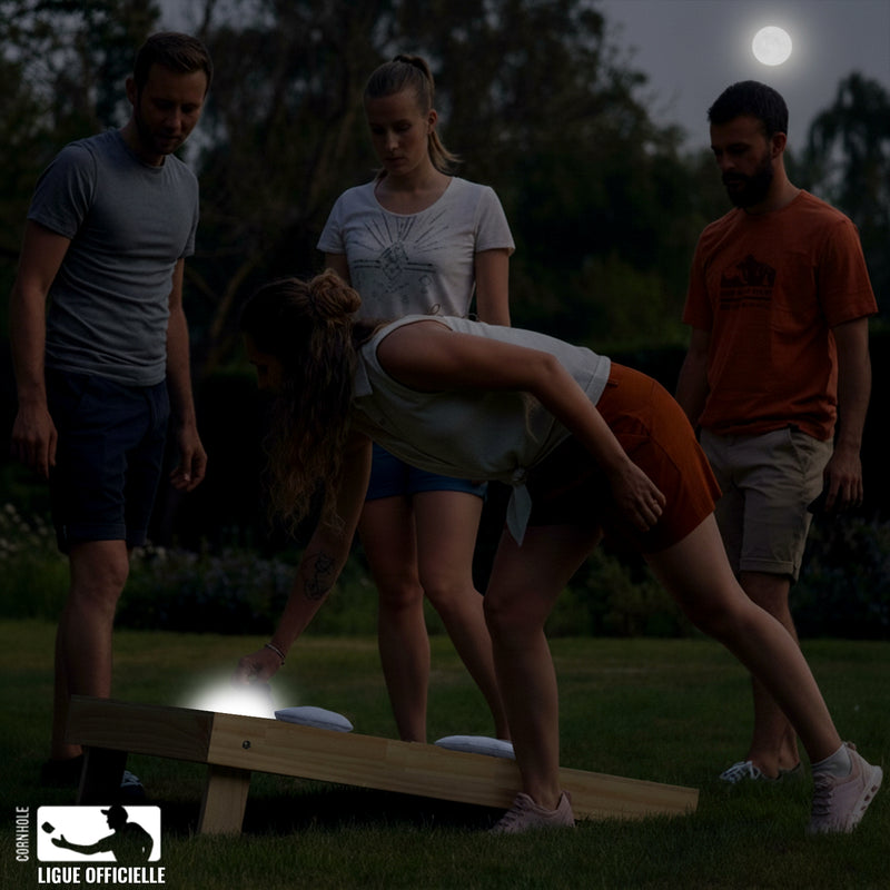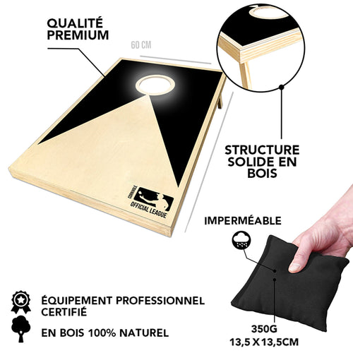 KIT COMPLET : Ce Kit officiel Cornhole comprend 2 planches en bois avec pieds pliables et 8 Sacs en tissu noirs et blancs. Léger et facile à transporter grâce à sa housse de protection. Jeu d'extérieur idéal pour jouer entre amis et l'emmener partout lors de weekends ou vacances.