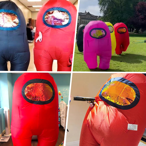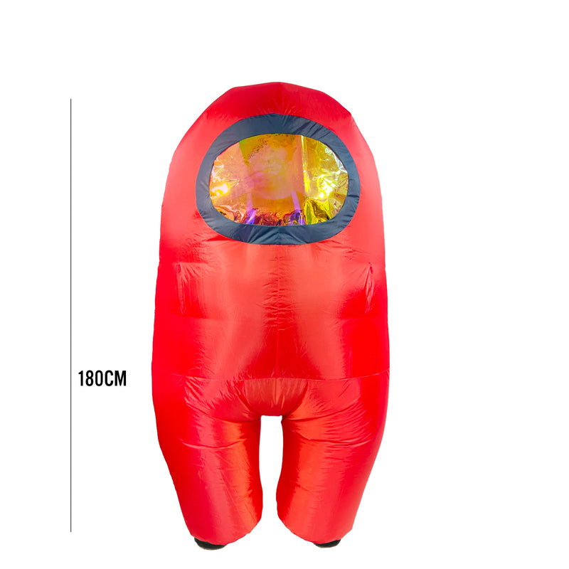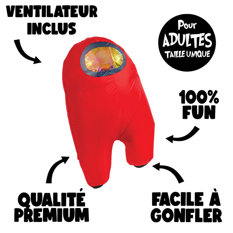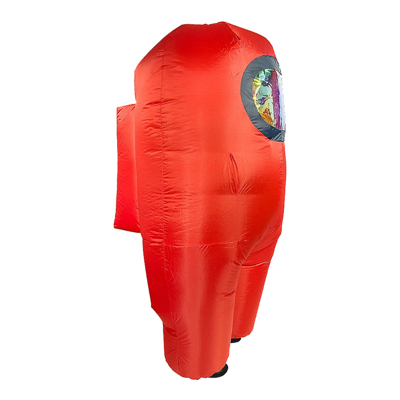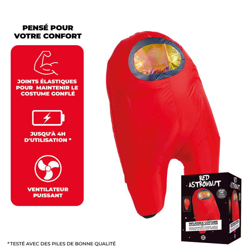 Déguisement gonflable insolite Astronaute Rouge. Facile à gonfler grâce à ses 2 ventilateurs intégrés fonctionnant avec piles (type AA non fournies).