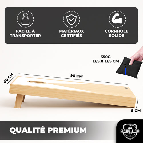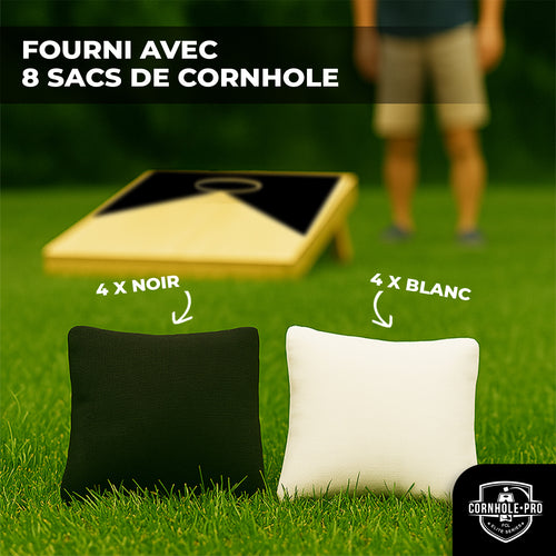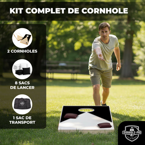 KIT COMPLET : Ce Kit officiel Cornhole comprend 2 planches en bois avec pieds pliables et 8 Sacs en tissu rouges et bleus. Léger et facile à transporter grâce à sa housse de protection. Jeu d'extérieur idéal pour jouer entre amis et l'emmener partout lors de weekends ou vacances.