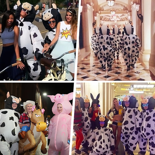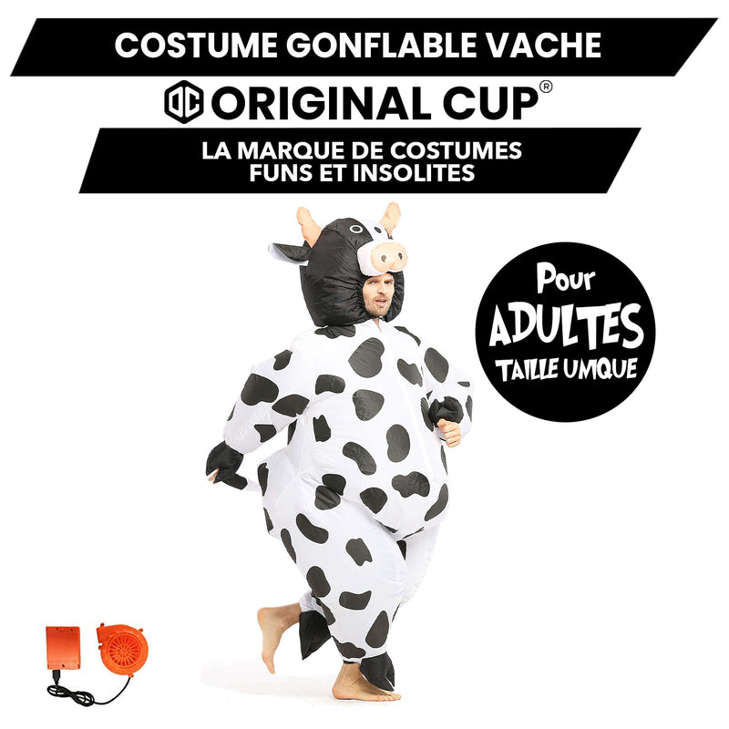 Déguisement gonflable insolite de Vache. Facile à gonfler grâce à ses 2 ventilateurs intégrés fonctionnant avec piles (type AA non fournies).
