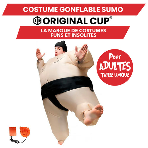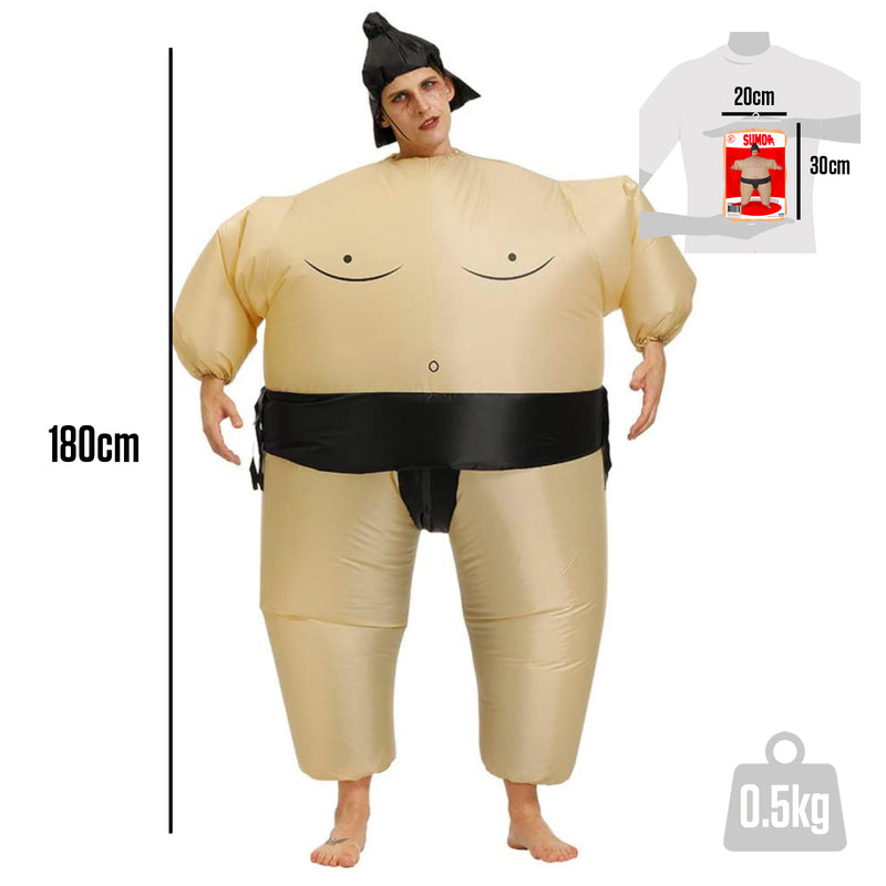 Déguisement gonflable insolite de Sumo. Facile à gonfler grâce à ses 2 ventilateurs intégrés fonctionnant avec piles (type AA non fournies).