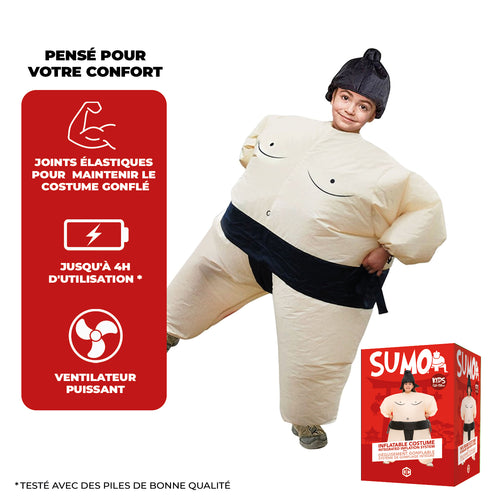 Déguisement gonflable insolite de Sumo. Facile à gonfler grâce à ses 2 ventilateurs intégrés fonctionnant avec piles (type AA non fournies).